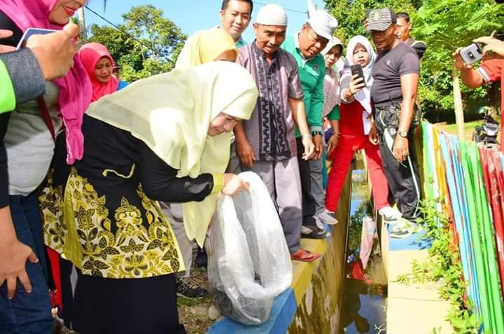 PADANG, KABARSUMBAR – Ketua TP PKK Kota Padang, Harneli didampingi Camat Nanggalo Teddy Antonius, Ketua PKK Kecamatan Evi Rozana menebar 10.500 bibit ikan nila di drainase yang memiliki panjang 400 meter di Pagang Dalam, Kelurahan Kurao Pagang, Kecamatan Nanggalo, Minggu (2/12/2018). Bibit ikan tersebut merupakan bantuan dari Dinas Perikanan Kota Padang.
