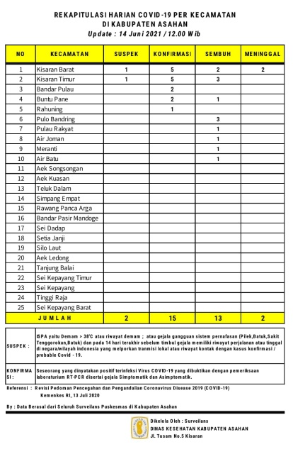 Asahan – Rekapitulasi harian Covid-19 per kecamatan untuk hari ini sebagaimana data surveilans dari seluruh Puskesmas yang ada di wilayah Kabupaten Asahan yang di kelola Dinas Kesehatan Kabupaten Asahan ada 2 warga Asahan suspek, 15 Konfirmasi, 13 Sembuh dan 2 meninggal dunia akibat Covid-19 pada Senin, 14 Juni 2021 pukul 12.00 wib.