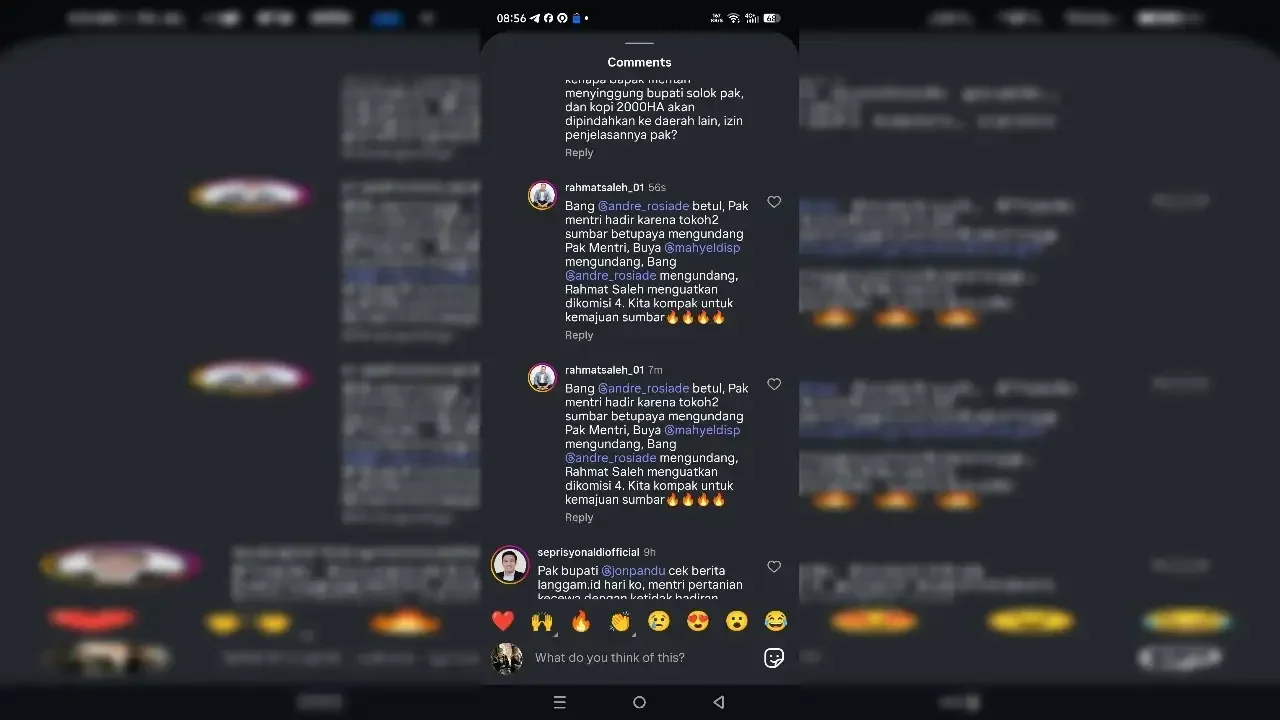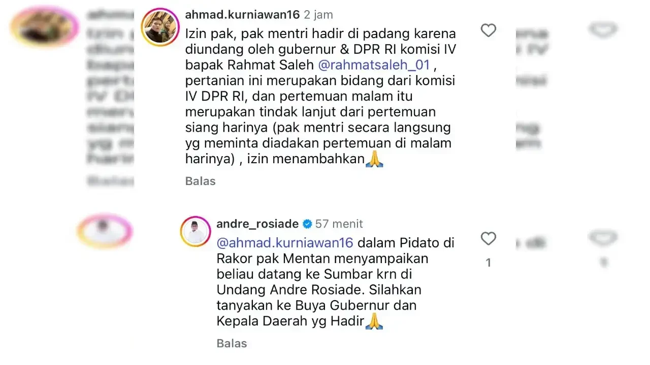 Di kolom komentar unggahan tersebut, Andre menjawab komentar salah satu netizen soal Mentan hadir ke Sumbar karena diundang oleh Gubernur Sumbar Mahyeldi dan Anggota Komisi IV DPR RI Rahmat Saleh.
