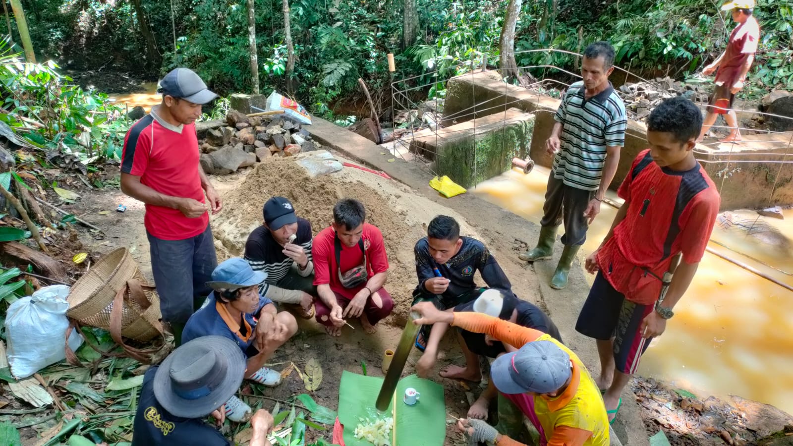 Landak – Anggota Satgas TMMD 110/Kodim 1201 Mempawah – Landak, sedang makanan tradisional di Dusun Palah, Desa Tolok, Kecamatan Menyuke, Kabupaten Landak.