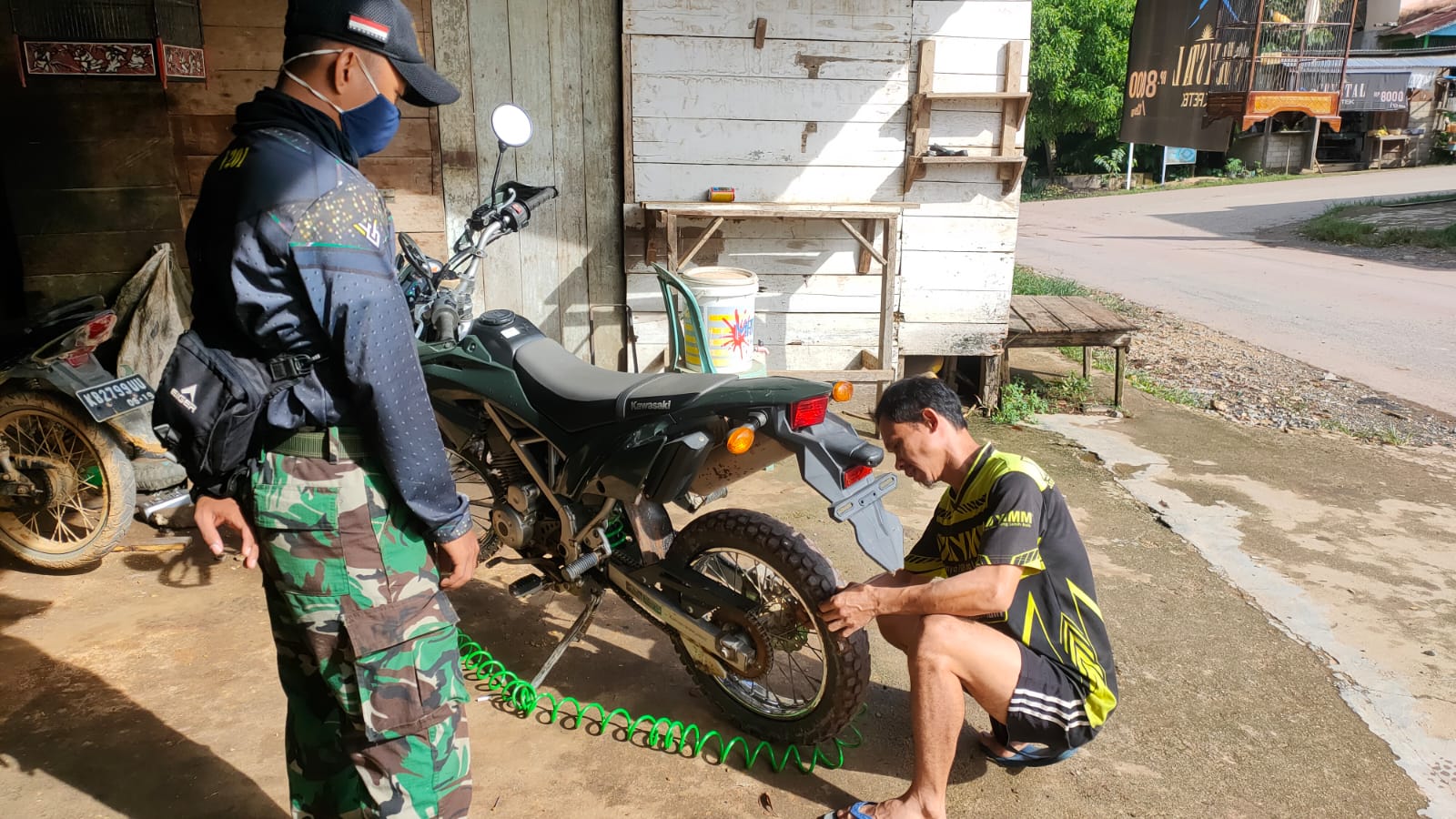 Landak – Anggota Satgas TMMD 110/Kodim 1201 Mempawah – Landak, singgahi bengkel untuk memompa ban motor dinas yang kempis, Desa Tolok, Kecamatan Menyuke, Kabupaten Landak.