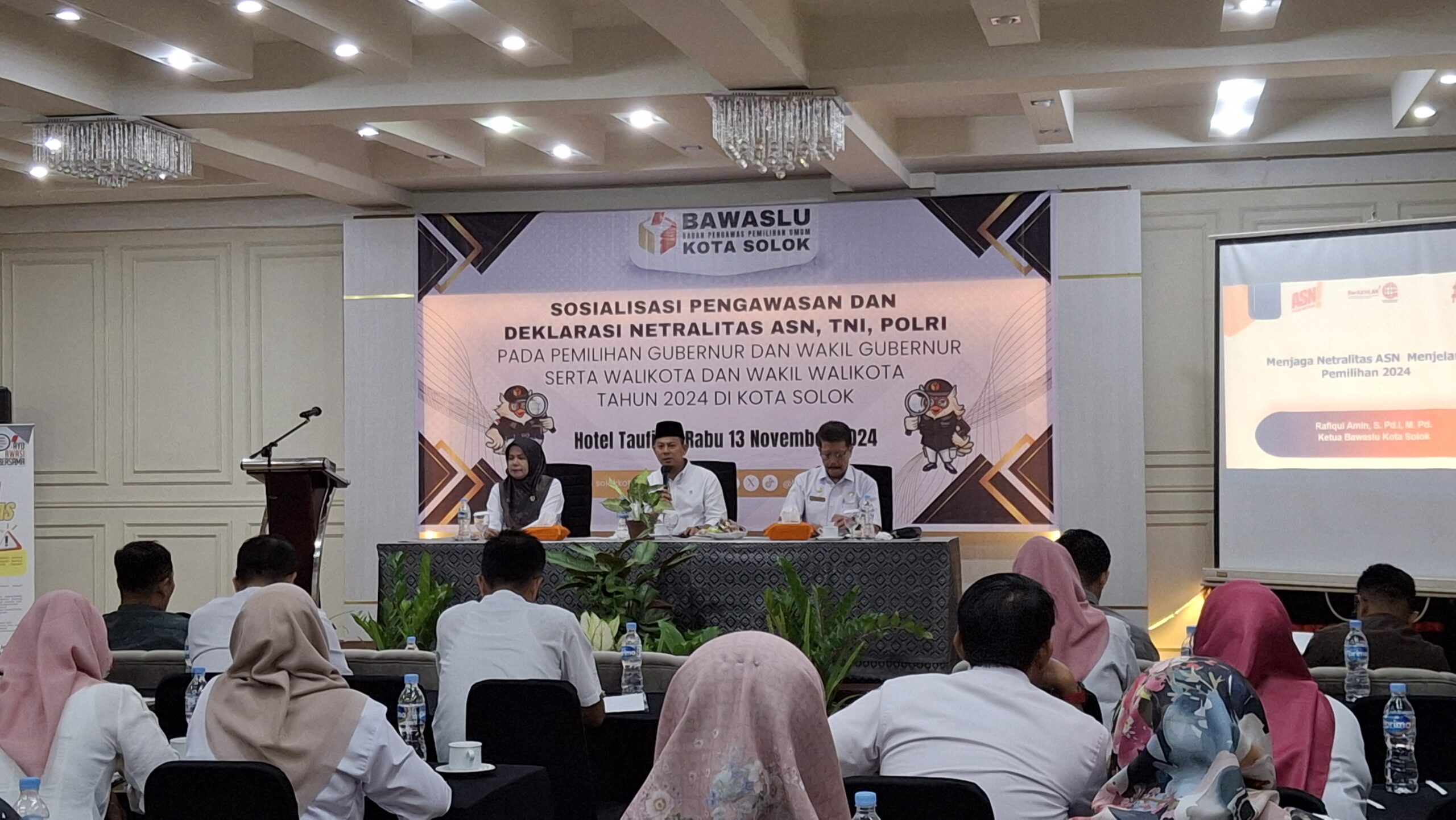 Solok Kota – Jelang Pemilihan Serentak Gubernur dan Wakil Gubernur Provinsi Sumatera Barat serta Wali Kota dan Wakil Wali Kota Solok, Badan Pengawas Pemilihan Umum (Bawaslu) Kota Solok kembali menegaskan netralitas Apartur Sipil Negara (ASN), TNI, dan Polri dalam kegiatan Sosialisasi Pengawasan dan Deklarasi Netralitas ASN, TNI, dan Polri di lingkup Kota Solok.
