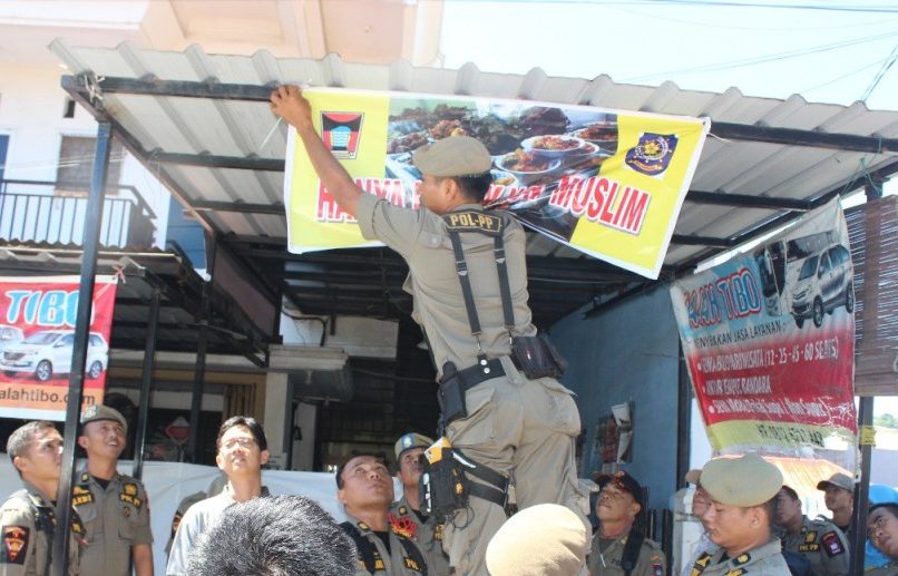 Petugas juga langsung memasangkan spanduk resmi dari Pemko Padang didepan rumah makan tersebut dengan tulisan ‘hanya untuk non muslim’.