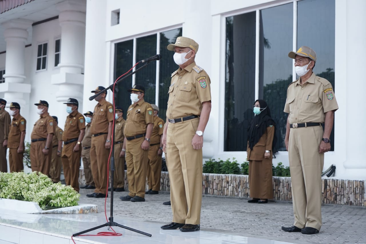 Asahan – Bupati Asahan H. Surya, BSc memimpin Apel Gabungan yang bertempat di Halaman Kantor Bupati Asahan, Senin, 5 April 2021.