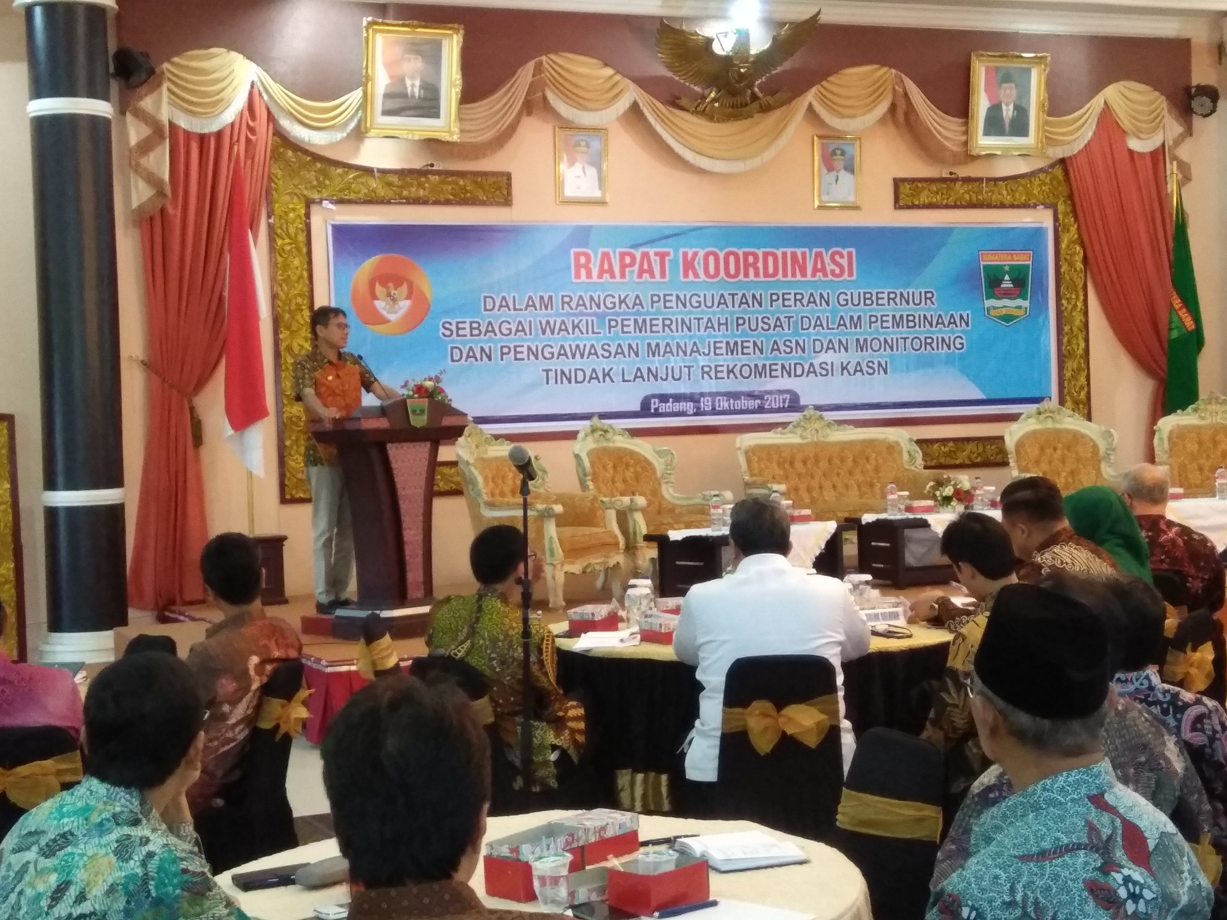 Hal di atas disampaikan Gubernur Sumbar Irwan Prayitno di hadapan bupati/wali kota se-Sumbar dalam Rapat Koordinasi dalam Rangka Penguatan sebagai Wakil Pemerintah Pusat dalam Pembinaan dan Pengawasan Manajemen dan Monitoring Tindak Lanjut Rekomendasi KASN di Auditorium Gubernuran, Kamis, 19 Oktober 2017.