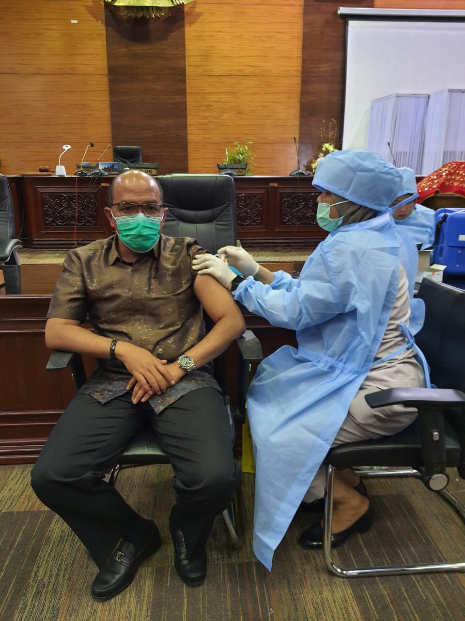 Padang – Ketua Dewan Perwakilan Rakyat Daerah Provinsi Sumatera Barat Supardi menjalani vaksinasi Covid-19 dosis kedua di gedung DPRD Sumatera Barat pada Senin, 12 April 2021.