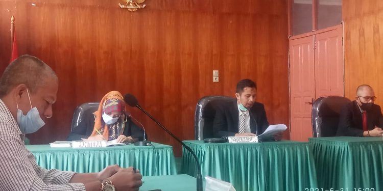 Tampak sidang dipimpin Majelis Komisioner KI Sumbar, Tanti Endang Lestari, Arif Yumadi, Adrian Tuswandi dan Panitera Pengganti, Tiwi Utami, ini dengan agenda putusan pemohon dengan termohon, nomor: 74/V/PTSN-PS/KISB/2021.