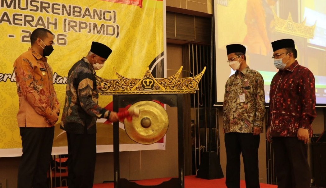 Padang – Gubernur Sumbar Mahyeldi membuka secara resmi, Musyawarah Rencana Pembangunan (Musrenbang) Rencana Pembangunan Jangka Menengah Daerah (RPJMD) Provinsi Sumatera Barat (Sumbar) tahun 2021-2026, dengan mengusung visi “Terwujudnya Sumatera Barat Madani yang Unggul dan Berkelanjutan”   di Sati Hall, Pangeran Beach Hotel pada, Kamis 6 Mei 2021.