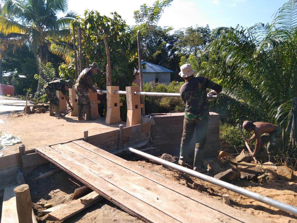 Terlihat anggota Satgas TMMD bersama warga masyarakat bahu membahu dipemasangan besi pengaman jembatan yang menjadi salah satu program satgas TMMD yang dikerjakan.