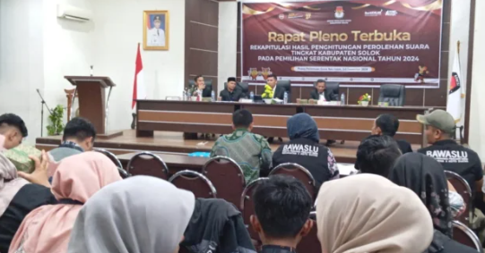 Setelah menuntaskan rekapitulasi tingkat kecamatan, KPU Kabupaten Solok melangsungkan rapat pleno terbuka rekapitulasi hasil perhitungan suara dan penetapan hasil pemilihan Gubernur dan Wakil Gubernur Sumatra Barat serta Bupati dan Wakil Bupati Solok tahun 2024.