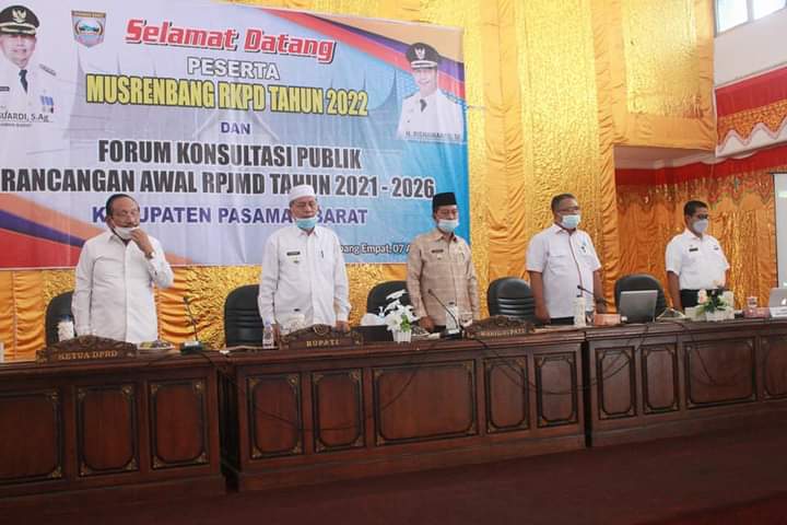 Pasaman Barat – Musyawarah Perencanaan Pembangunan (Musrenbang) Rencana Kerja Pemerintah Daerah (RKPD) Tahun 2022 dan Forum Konsultasi Publik Rancangan Awal Rencana Pembangunan Jangka Menengah Daerah (RPJMD) Tahun 2021-2026 tingkat Kabupaten Pasaman Barat (Pasbar) dimulai dan secara resmi dibuka oleh Bupati Hamsuardi, Rabu 7, April 2021 Maret di aula kantor bupati setempat.