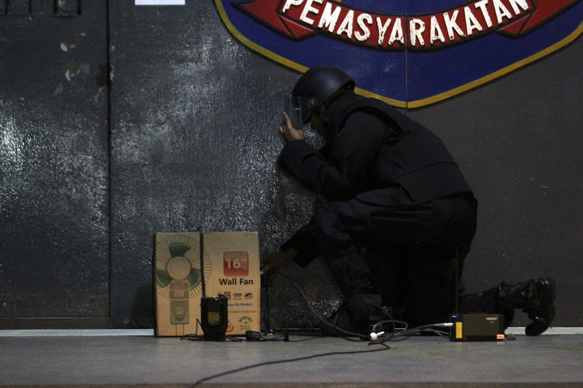 AMANKAN | Tim Penjinak Bom (Jibom) Gegana Brimob Polda Sumatera Barat mengamankan kotak diduga bom depan pintu masuk Lembaga Permasyarakatan Kelas IIA Padang, Kamis dini hari (22/6/2017). Photo Dokumenter : Kariadil Harefa.