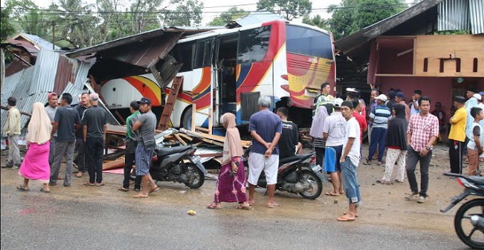 Satu unit bus Jatra menabrak sebuah warung di kawasan Sibusuk, Sijunjung, Sabtu 21 Desember 2019. Foto : Topsatu