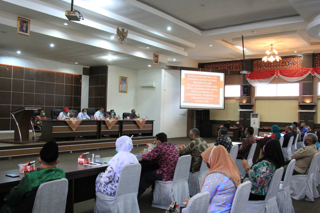 Solok Arosuka – Bertempat di Ruang Solok Nan Indah Kantor Bupati Solok di Arosuka, Pemerintah Daerah Kabupaten Solok, Kamis 22 Oktober 2020, menggelar acara sosialisasi netralitas pegawai Aparatur Sipil Negara (ASN) dalam rangka pelaksanaan pemilihan kepala daerah serentak (Bupati dan Wakil Bupati Solok) tahun 2020.