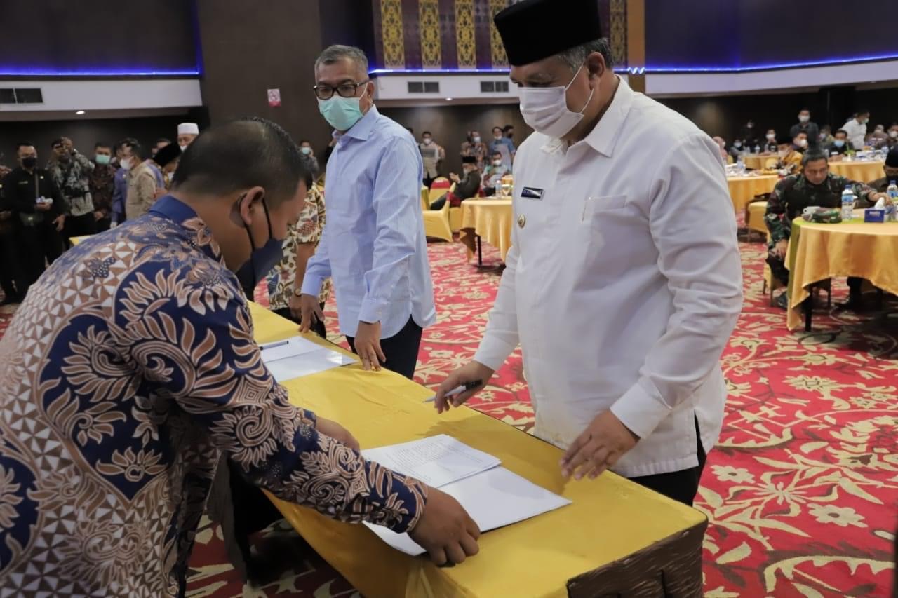Solok Kota – Jum’at 4 Juni 2021, bertempat di Hotel Kyriad Bumiminang, Kota Padang, Wali Kota Solok Zul Elfian Umar, bersama seluruh kepala daerah di Provinsi Sumatera Barat, menandatangani kesepakatan bersama dengan Kementerian Hukum dan Hak Asasi Manusia RI Kantor Wilayah Sumatera Barat.