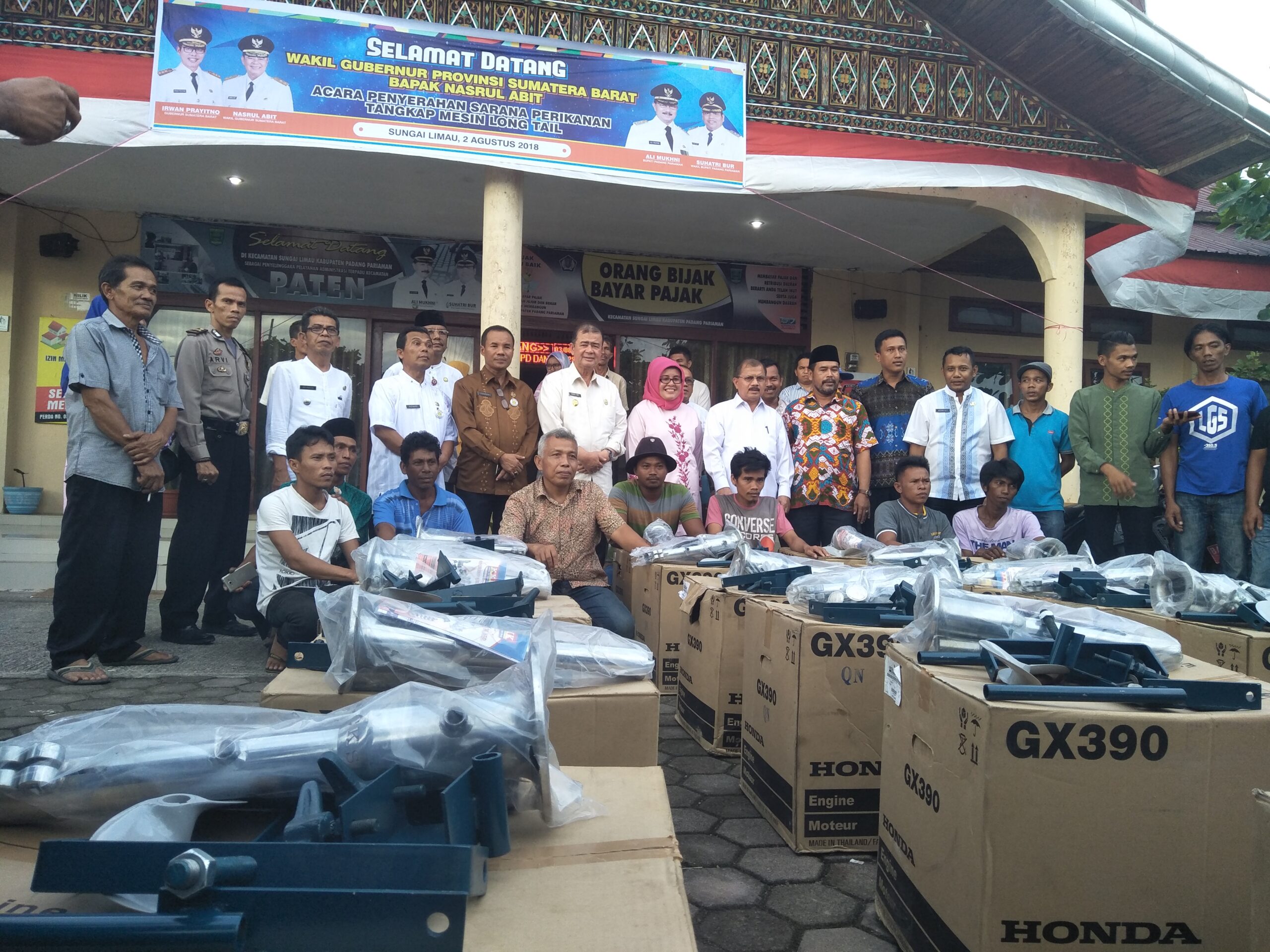 PADANG PARIAMAN, KABARSUMBAR – Pemerintah Provinsi Sumatra Barat (Sumbar) menyerahkan bantuan perlengkapan kapal berupa 19 unit mesin long tail kepada nelayan Sungai Limau, Kabupaten Padang Pariaman.