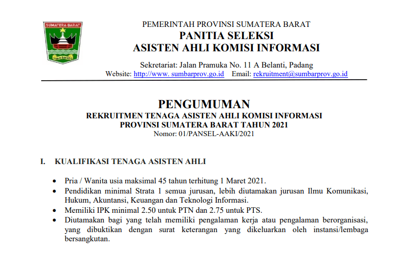 Pengumuman Rekrutmen Tenaga Ahli Komisi Informasi Sumbar