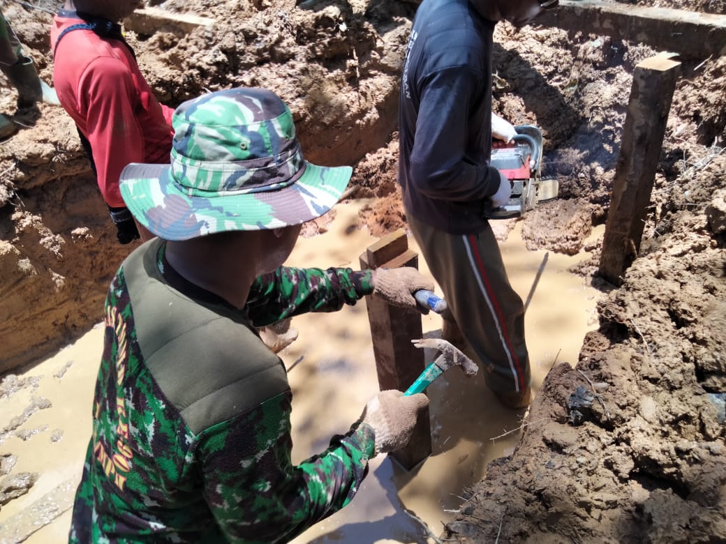 Landak – Anggota TNI dituntut dapat melakukan banyak hal, terlihat personil Satgas TMMD 110/Kodim 1201 Mempawah – Landak, terlihat sedang memahat pembangunan jembatan box Cluvert
