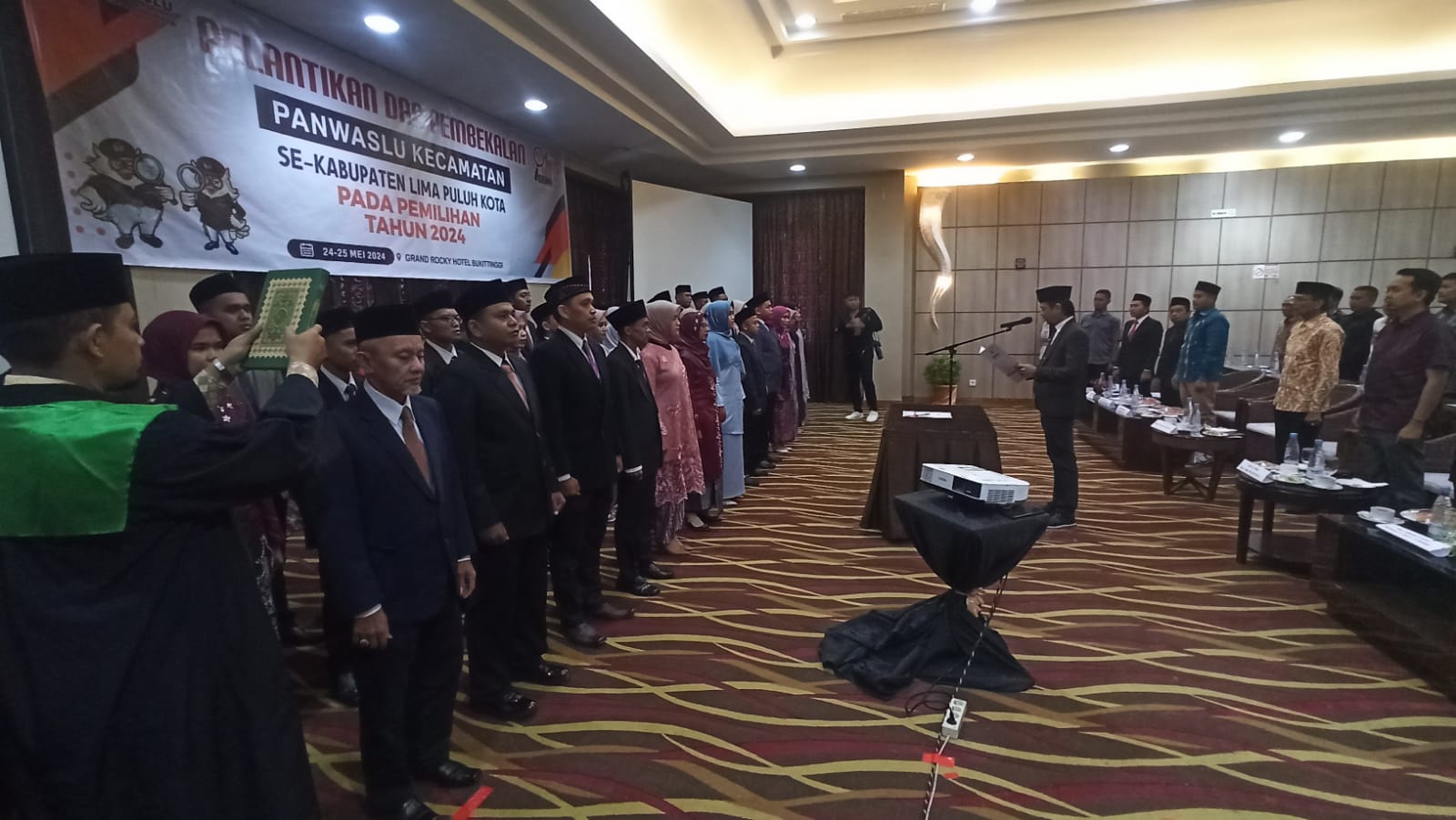 Bukittinggi – Ketua Badan Pengawas Pemilu (BAWASLU) Kabupaten Lima Puluh Kota, Yoriza Asra melantik dan mengambil sumpah jabatan puluhan anggota Panitia Pengawas Pemilu Kecamatan (PANWASCAM) se-Kabupaten Lima Puluh Kota, di salah satu hotel di Kota Bukittinggi, Jumat siang (24/5).
