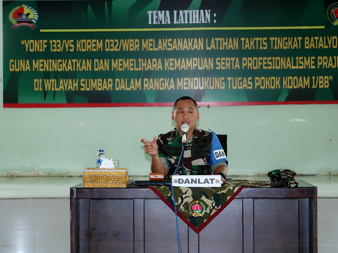 PADANG, KABARSUMBAR – Guna meningkatkan dan memelihara profesionalisme prajurit di wilayah Sumatra Barat (Sumbar), Danrem 032/Wbr Brigjen TNI Mirza Agus, membuka Latihan Teknis dan Taktis (Latnistis) tingkat Batalyon yang dilaksanakan di Aula Yonif 133/YS, Senin (03/12/2018).